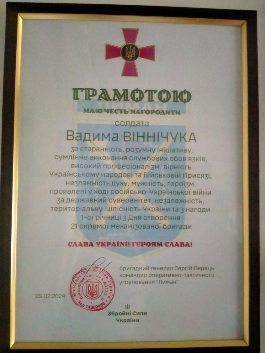 5 березня Вадим Віннічук загинув, виконуючи бойове завдання поблизу населеного пункту Терни. Хлопець довгий час вважався безвісти зниклим. За життя був нагороджений за героїзм проявлений у ході російсько-української війни. Він був справжнім патріотом, мужнім, щирим, сильним. Вірив у перемогу України. Похований 28 березня 2024 року в селі Хороша вінницької області